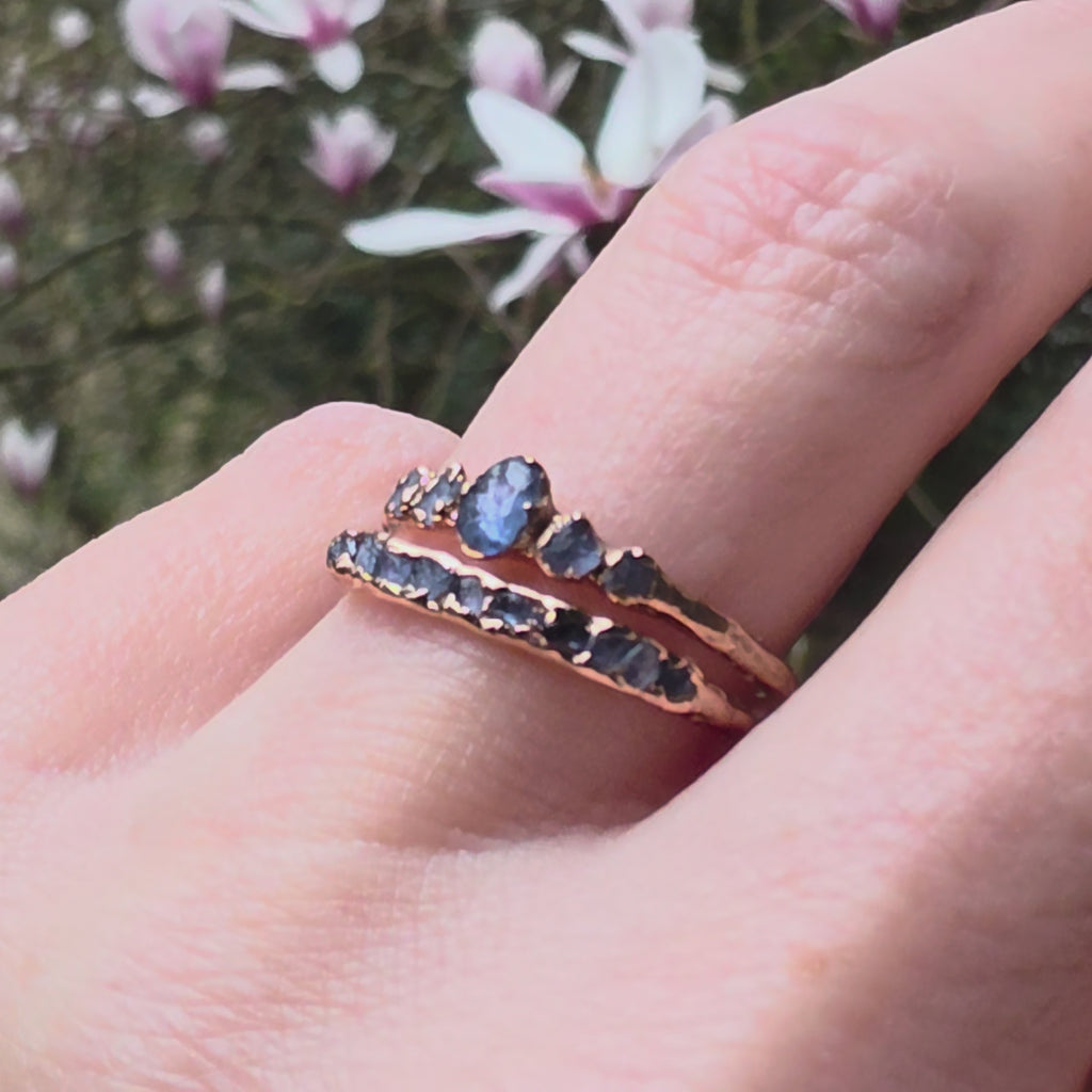 This five-stone crown features natural raw blue sapphires set organically into solid gold. The design feels light and refined while still carrying the powerful elemental character that defines all byAngeline rings.