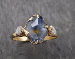 Raw rough and partially faceted (by my husband) Blue and gold colored Montana sapphire with raw conflict-free diamonds on each side. I hand carved this ring in wax and cast it in recycled solid 14k yellow gold using the lost wax casting process. This one of a kind raw gemstone ring is a size 7 it can be sized. The sapphire stone measures about 9mm X 6.5mm. The 2 rough diamonds are about 3mm.