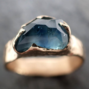Partially faceted (by my husband) Montana sapphire. It is primarily blue tones. I hand carved this ring in wax and cast it in recycled solid 14k yellow gold using the lost wax casting process. This one of a kind gemstone ring is a size 7 it can be resized. The sapphire stone measures about 7x10mm. The band is about 5mm.
